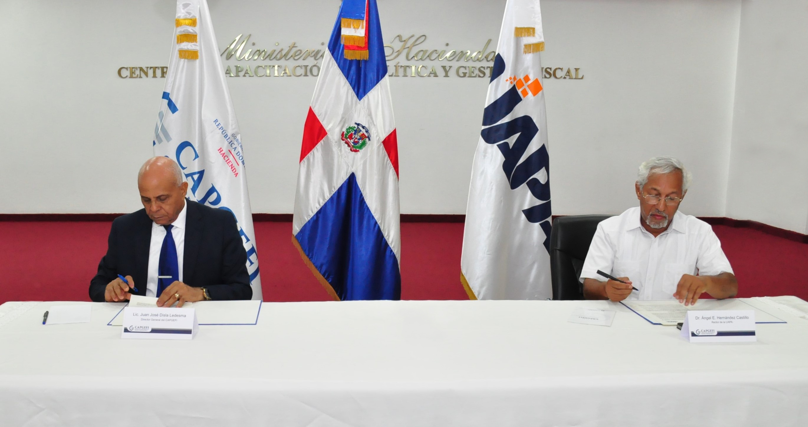 El convenio fue rubricado por el Lic. Juan José Disla, Director General del Centro de Capacitación en Política y Gestión Fiscal y el Dr. Angel Enrique Hernández, Rector de la UAPA.