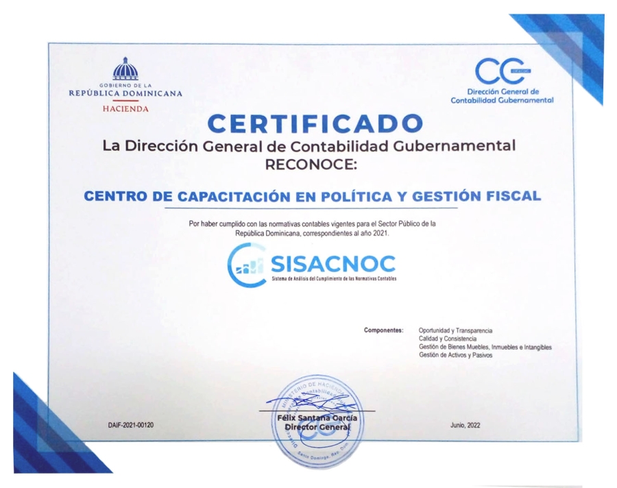 Santo Domingo. - La Dirección General de Contabilidad Gubernamental (DIGECOG), órgano rector del sistema de contabilidad gubernamental de la República Dominicana, reconoció al Centro de Capacitación en Política y Gestión Fiscal, por haber cumplido con las normativas contables vigentes para el sector público, correspondiente al año 2021.