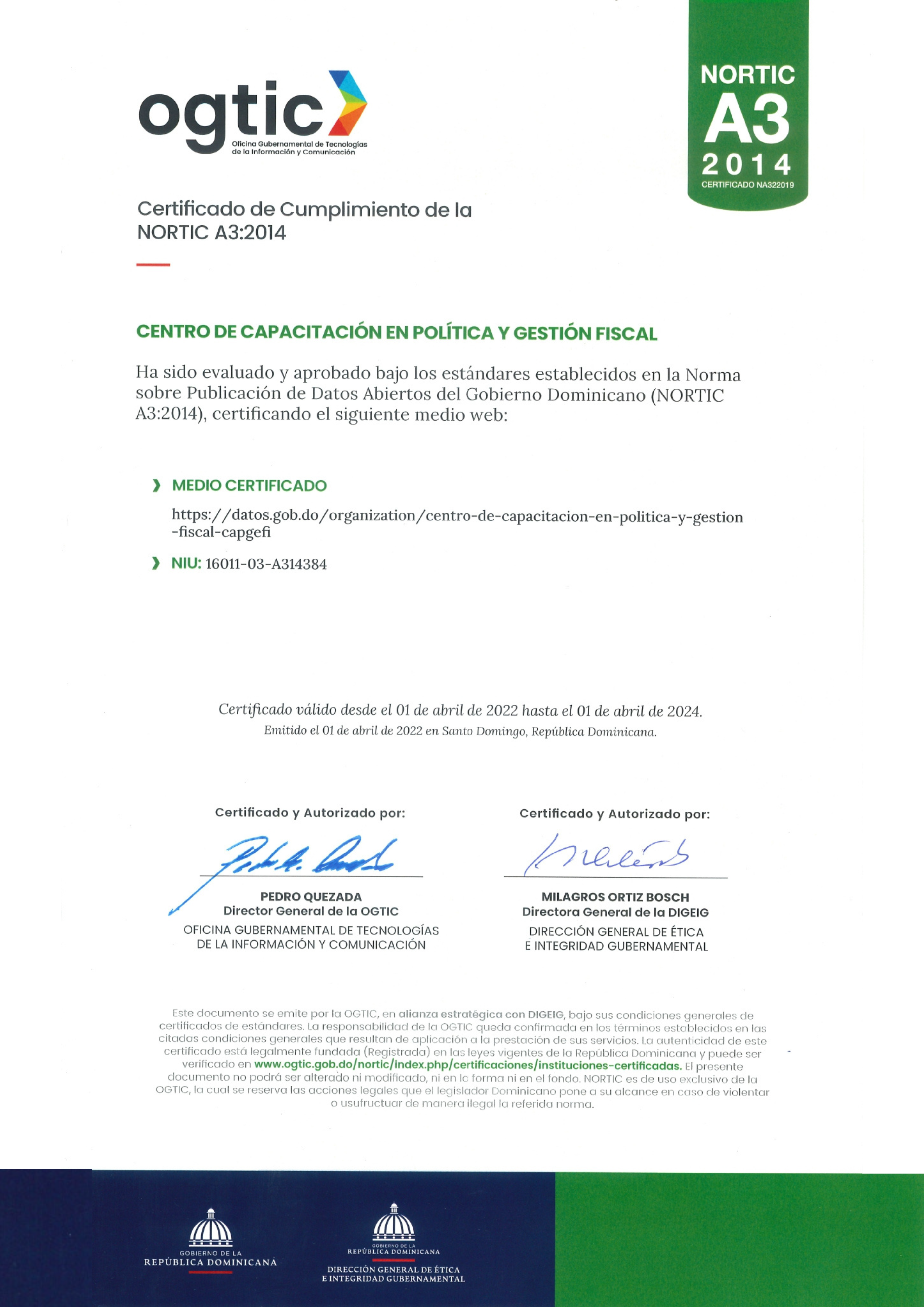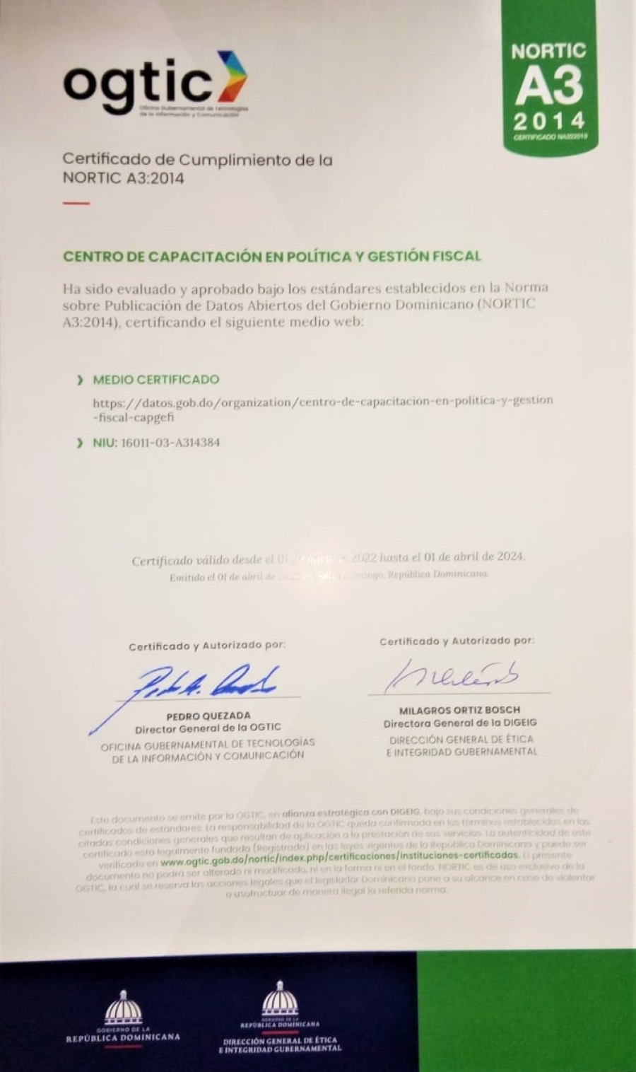 Santo Domingo. – El Centro de Capacitación en Política y Gestión Fiscal recibió de parte de la Oficina Gubernamental de Tecnologías de la Información y Comunicación (OGTIC) y la Dirección General de Ética e Integridad Gubernamental (DIGEIG), la actualización de la certificación Nortic A3:2014, sobre Publicación de Datos Abiertos del Gobierno Dominicano.